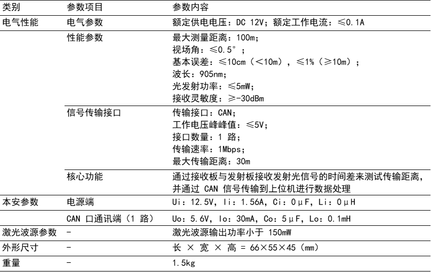GUJ100矿用本安型激光测距传感器(以下简称激光测距传感器)。激光测距传感器采用TOF方案,能够对前方障碍物进行距离探测。